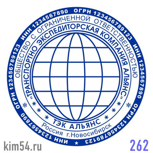 Печать организации с глобусом № 262. Срочное изготовление печати ООО - 15 минут. Стандартный срок изготовления печати организации от 2-х до 4-х часов. Размер печати ООО - 38 мм. Если требуется согласование макета печати организации или срочное изготовл...