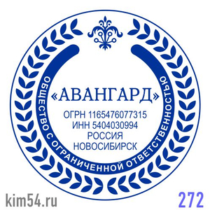 Заказать печать организации № 272. Срочное изготовление печати ООО - 15 минут. Стандартный срок изготовления печати организации от 2-х до 4-х часов. Размер печати ООО - 38 мм. Если требуется согласование макета печати организации или срочное изготовлен...