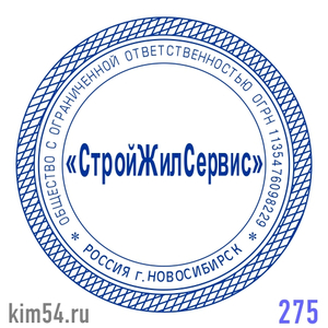 Заказать печать организации № 275. Срочное изготовление печати ООО - 15 минут. Стандартный срок изготовления печати организации от 2-х до 4-х часов. Размер печати ООО - 38 мм. Если требуется согласование макета печати организации или срочное изготовлен...