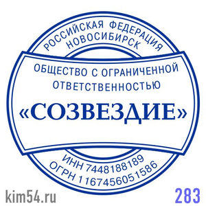 Заказать печать организации, печать ООО № 283. Срочное изготовление печати ООО - 15 минут. Стандартный срок изготовления печати организации от 2-х до 4-х часов. Размер печати ООО - 38 мм. Если требуется согласование макета печати организации или срочно...