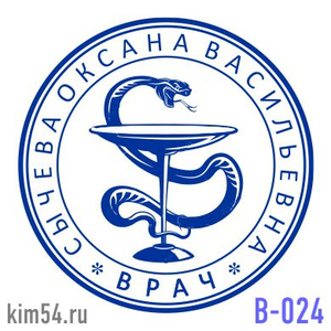 Заказать печать врача с сосудом Гигеи и змеей В-24. Срочное изготовление печати врача 15 минут. Стандартный срок изготовления печати врача - 2 часа. Печать врача изготавливается диаметром - 25-30 мм. Оптимальный размер врачебной печати составляет 29 мм...