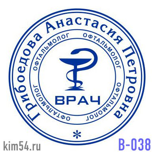 Заказать печать врача В-38. Срочное изготовление печати врача 15 минут. Стандартный срок изготовления печати врача - 2 часа. Печать врача изготавливается диаметром - 25-30 мм. Оптимальный размер врачебной печати составляет 29 мм. Возможно изготовление ...