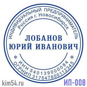 Заказать печать ИП-8. Печать предпринимателя, печать самозанятого гражданина. Срочное изготовление печати - 15 минут. Обычный срок изготовления - 2 часа. Диаметр печати - 38 мм. В печати ИП обязательно указывается ФИО предпринимателя. ИНН, ОГРНИП указы...