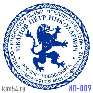 Печать с геральдическим львом. Печать ИП-9. Срочное изготовление печати - 15 минут. Обычный срок изготовления - 2 часа. Диаметр печати - 38 мм. В печати ИП обязательно указывается ФИО предпринимателя. ИНН, ОГРНИП указывается по желанию. На основе шабло...