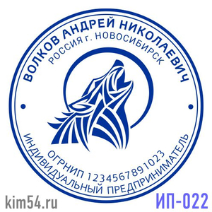 Заказать печать с волком. Печать ИП-022. Срочное изготовление печати - 15 минут. Обычный срок изготовления - 2 часа. Диаметр печати - 38 мм. В печати ИП обязательно указывается ФИО предпринимателя. ИНН, ОГРНИП указывается по желанию. На основе шаблона ...