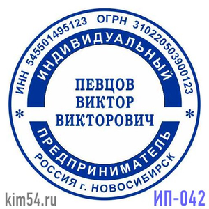 Заказать печать предпринимателя, печать ИП-042. Срочное изготовление печати - 15 минут. Обычный срок изготовления - 2 часа. Диаметр печати - 38 мм. В печати ИП обязательно указывается ФИО предпринимателя. ИНН, ОГРНИП указывается по желанию. На основе ш...