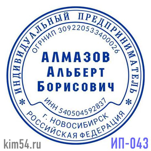 Заказать печать предпринимателя, печать ИП-043. Срочное изготовление печати - 15 минут. Обычный срок изготовления - 2 часа. Диаметр печати - 38 мм. В печати ИП обязательно указывается ФИО предпринимателя. ИНН, ОГРНИП указывается по желанию. На основе ш...