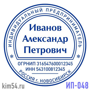 Заказать печать ИП-048. Простая печать предпринимателя. Срочное изготовление печати - 15 минут. Обычный срок изготовления - 2 часа. Диаметр печати - 38 мм. В печати ИП обязательно указывается ФИО предпринимателя. ИНН, ОГРНИП указывается по желанию. На ...