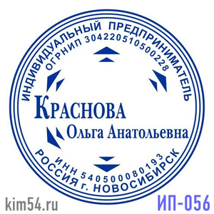 Заказать печать ИП-056. Срочное изготовление печати - 15 минут. Обычный срок изготовления - 2 часа. Диаметр печати - 38 мм. В печати ИП обязательно указывается ФИО предпринимателя. ИНН, ОГРНИП указывается по желанию. На основе шаблона печати предприним...