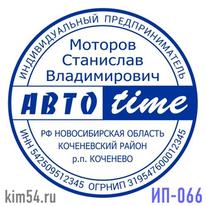 Заказать печать ИП-066. Срочное изготовление печати - 15 минут. Обычный срок изготовления - 2 часа. Диаметр печати - 38 мм. В печати ИП обязательно указывается ФИО предпринимателя. ИНН, ОГРНИП указывается по желанию. На основе шаблона печати предприним...