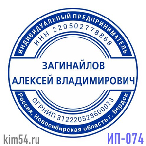 Заказать печать ИП-074. Срочное изготовление печати - 15 минут. Обычный срок изготовления - 2 часа. Диаметр печати - 38 мм. В печати ИП обязательно указывается ФИО предпринимателя. ИНН, ОГРНИП указывается по желанию. На основе шаблона печати предприним...