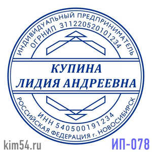 Заказать печать ИП-078. Срочное изготовление печати - 15 минут. Обычный срок изготовления - 2 часа. Диаметр печати - 38 мм. В печати ИП обязательно указывается ФИО предпринимателя. ИНН, ОГРНИП указывается по желанию. На основе шаблона печати предприним...