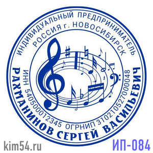 Печать с нотами, печать с скрипичным ключом, печать музыканта ИП-084 Срочное изготовление печати - 15 минут. Обычный срок изготовления - 2 часа. Диаметр печати - 38 мм. В печати ИП обязательно указывается ФИО предпринимателя. ИНН, ОГРНИП указывается по...