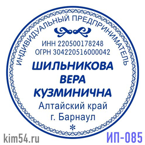 Заказать печать с красивой рамкой, печать ИП-085. Срочное изготовление печати - 15 минут. Обычный срок изготовления - 2 часа. Диаметр печати - 38 мм. В печати ИП обязательно указывается ФИО предпринимателя. ИНН, ОГРНИП указывается по желанию. На основе...
