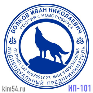 Заказать печать с волком ИП-101. Срочное изготовление печати - 15 минут. Обычный срок изготовления - 2 часа. Диаметр печати - 38 мм. В печати ИП обязательно указывается ФИО предпринимателя. ИНН, ОГРНИП указывается по желанию. На основе шаблона печати п...
