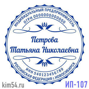 Печать растительным орнаментом ИП-107. Срочное изготовление печати - 15 минут. Обычный срок изготовления - 2 часа. Диаметр печати - 38 мм. В печати ИП обязательно указывается ФИО предпринимателя. ИНН, ОГРНИП указывается по желанию. На основе шаблона пе...