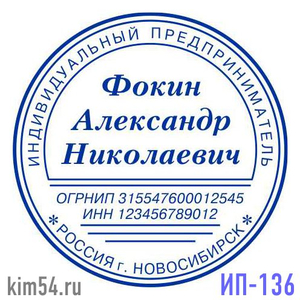 Заказать печать ИП-136. Срочное изготовление печати - 15 минут. Обычный срок изготовления - 2 часа. Диаметр печати - 38 мм. В печати ИП обязательно указывается ФИО предпринимателя. ИНН, ОГРНИП указывается по желанию. На основе шаблона печати предприним...