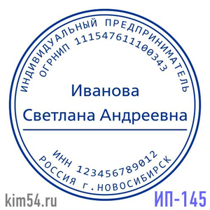 Заказать печать ИП-145 Срочное изготовление печати - 15 минут. Обычный срок изготовления - 2 часа. Диаметр печати - 38 мм. В печати ИП обязательно указывается ФИО предпринимателя. ИНН, ОГРНИП указывается по желанию. На основе шаблона печати предпринима...
