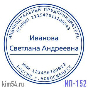 Заказать печать ИП-152. Срочное изготовление печати - 15 минут. Обычный срок изготовления - 2 часа. Диаметр печати - 38 мм. В печати ИП обязательно указывается ФИО предпринимателя. ИНН, ОГРНИП указывается по желанию. На основе шаблона печати предприним...