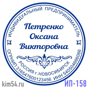 Заказать печать с красивым шрифтом и узором. Печать ИП-158 Срочное изготовление печати - 15 минут. Обычный срок изготовления - 2 часа. Диаметр печати - 38 мм. В печати ИП обязательно указывается ФИО предпринимателя. ИНН, ОГРНИП указывается по желанию. ...