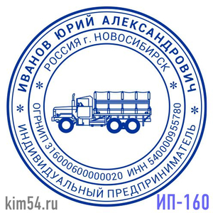 Заказать печать с грузовиком. Печать ИП-160. Срочное изготовление печати - 15 минут. Обычный срок изготовления - 2 часа. Диаметр печати - 38 мм. В печати ИП обязательно указывается ФИО предпринимателя. ИНН, ОГРНИП указывается по желанию. На основе шабл...