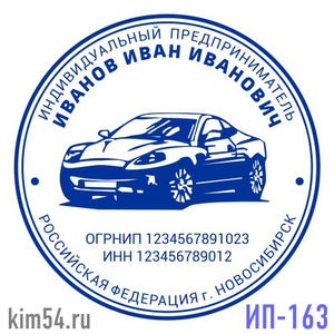 Печать со спортивным автомобилем. Заказать печать ИП-163. Срочное изготовление печати - 15 минут. Обычный срок изготовления - 2 часа. Диаметр печати - 38 мм. В печати ИП обязательно указывается ФИО предпринимателя. ИНН, ОГРНИП указывается по желанию. Н...