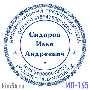 Заказать печать ИП-165. Срочное изготовление печати - 15 минут. Обычный срок изготовления - 2 часа. Диаметр печати - 38 мм. В печати ИП обязательно указывается ФИО предпринимателя. ИНН, ОГРНИП указывается по желанию. На основе шаблона печати предприним...