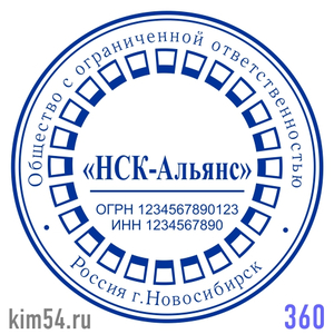 Заказать печать ООО № 360. Срочное изготовление печати ООО - 15 минут. Стандартный срок изготовления печати организации от 2-х до 4-х часов. Размер печати ООО - 38 мм. Если требуется согласование макета печати организации или срочное изготовление печат...