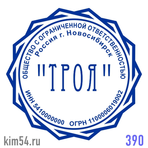 Заказать печать с красивой многоконечной рамкой № 390. Срочное изготовление печати ООО - 15 минут. Стандартный срок изготовления печати организации от 2-х до 4-х часов. Размер печати ООО - 38 мм. Если требуется согласование макета печати организации ил...