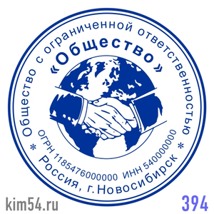 Печать с рукопожатием на фоне земного шара, печать ООО № 394. Срочное изготовление печати ООО - 15 минут. Стандартный срок изготовления печати организации от 2-х до 4-х часов. Размер печати ООО - 38 мм. Если требуется согласование макета печати организ...