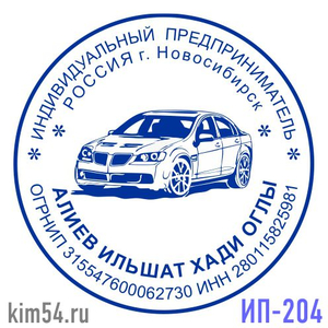 Заказать печать с автомобилем БМВ, печать ИП-204. Срочное изготовление печати - 15 минут. Обычный срок изготовления - 2 часа. Диаметр печати - 38 мм. В печати ИП обязательно указывается ФИО предпринимателя. ИНН, ОГРНИП указывается по желанию. На основе...