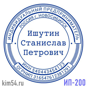 Заказать печать ИП-200. Срочное изготовление печати - 15 минут. Обычный срок изготовления - 2 часа. Диаметр печати - 38 мм. В печати ИП обязательно указывается ФИО предпринимателя. ИНН, ОГРНИП указывается по желанию. На основе шаблона печати предприним...