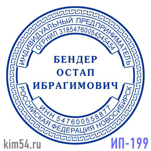 Заказать печать ИП-199. Срочное изготовление печати - 15 минут. Обычный срок изготовления - 2 часа. Диаметр печати - 38 мм. В печати ИП обязательно указывается ФИО предпринимателя. ИНН, ОГРНИП указывается по желанию. На основе шаблона печати предприним...