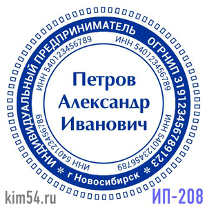 Заказать печать ИП-208. Срочное изготовление печати - 15 минут. Обычный срок изготовления - 2 часа. Диаметр печати - 38 мм. В печати ИП обязательно указывается ФИО предпринимателя. ИНН, ОГРНИП указывается по желанию. На основе шаблона печати предприним...