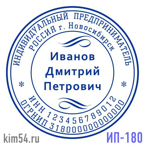 Заказать печать ИП-180. Срочное изготовление печати - 15 минут. Обычный срок изготовления - 2 часа. Диаметр печати - 38 мм. В печати ИП обязательно указывается ФИО предпринимателя. ИНН, ОГРНИП указывается по желанию. На основе шаблона печати предприним...