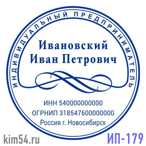 Заказать печать ИП-179. Срочное изготовление печати - 15 минут. Обычный срок изготовления - 2 часа. Диаметр печати - 38 мм. В печати ИП обязательно указывается ФИО предпринимателя. ИНН, ОГРНИП указывается по желанию. На основе шаблона печати предприним...