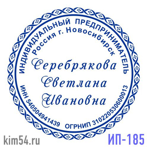 Заказать печать с красивой рамкой ИП-185. Срочное изготовление печати - 15 минут. Обычный срок изготовления - 2 часа. Диаметр печати - 38 мм. В печати ИП обязательно указывается ФИО предпринимателя. ИНН, ОГРНИП указывается по желанию. На основе шаблона...