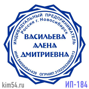 Заказать печать с рамкой в форме звезды. Печать ИП-184. Срочное изготовление печати - 15 минут. Обычный срок изготовления - 2 часа. Диаметр печати - 38 мм. В печати ИП обязательно указывается ФИО предпринимателя. ИНН, ОГРНИП указывается по желанию. На ...