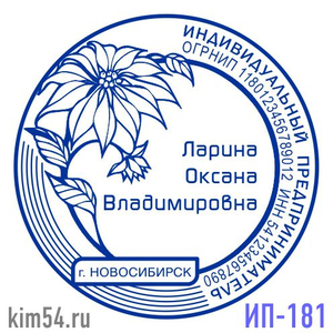 Заказать печать с цветком ИП-181. Срочное изготовление печати - 15 минут. Обычный срок изготовления - 2 часа. Диаметр печати - 38 мм. В печати ИП обязательно указывается ФИО предпринимателя. ИНН, ОГРНИП указывается по желанию. На основе шаблона печати ...