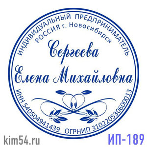 Заказать печать ИП-189. Срочное изготовление печати - 15 минут. Обычный срок изготовления - 2 часа. Диаметр печати - 38 мм. В печати ИП обязательно указывается ФИО предпринимателя. ИНН, ОГРНИП указывается по желанию. На основе шаблона печати предприним...