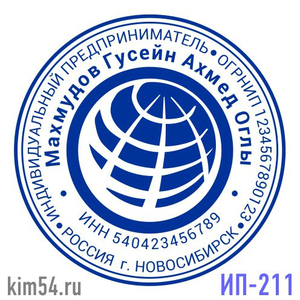 Заказать печать с стилизованным земным шаром ИП-211. Срочное изготовление печати - 15 минут. Обычный срок изготовления - 2 часа. Диаметр печати - 38 мм. В печати ИП обязательно указывается ФИО предпринимателя. ИНН, ОГРНИП указывается по желанию. На осн...