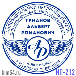 Заказать печать с крыльями и монограммой. Печать ИП-212. Срочное изготовление печати - 15 минут. Обычный срок изготовления - 2 часа. Диаметр печати - 38 мм. В печати ИП обязательно указывается ФИО предпринимателя. ИНН, ОГРНИП указывается по желанию. На...