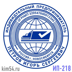 Заказать печать транспортной компании. Печать ИП-218. Срочное изготовление печати - 15 минут. Обычный срок изготовления - 2 часа. Диаметр печати - 38 мм. В печати ИП обязательно указывается ФИО предпринимателя. ИНН, ОГРНИП указывается по желанию. На ос...