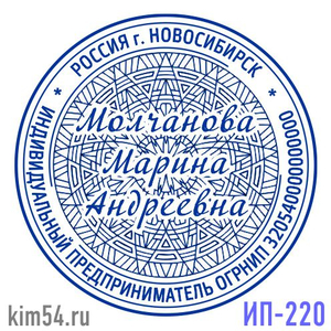 Заказать печать ИП-220. Срочное изготовление печати - 15 минут. Обычный срок изготовления - 2 часа. Диаметр печати - 38 мм. В печати ИП обязательно указывается ФИО предпринимателя. ИНН, ОГРНИП указывается по желанию. На основе шаблона печати предприним...