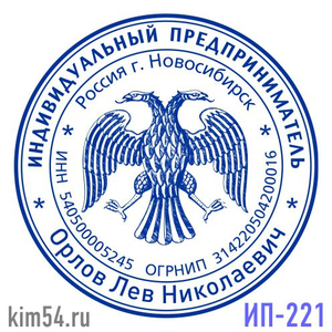 Заказать печать с двуглавым орлом. Печать ИП-221. Срочное изготовление печати - 15 минут. Обычный срок изготовления - 2 часа. Диаметр печати - 38 мм. В печати ИП обязательно указывается ФИО предпринимателя. ИНН, ОГРНИП указывается по желанию. На основе...