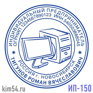 Печать компьютерного мастера, печать ИП-150 Срочное изготовление печати - 15 минут. Обычный срок изготовления - 2 часа. Диаметр печати - 38 мм. В печати ИП обязательно указывается ФИО предпринимателя. ИНН, ОГРНИП указывается по желанию. На основе шабло...