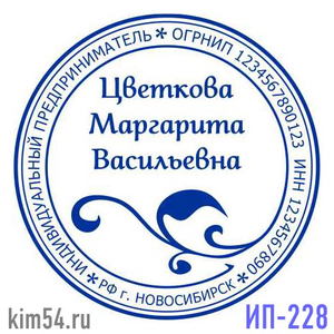 Заказать красивую печать ИП-228. Срочное изготовление печати - 15 минут. Обычный срок изготовления - 2 часа. Диаметр печати - 38 мм. В печати ИП обязательно указывается ФИО предпринимателя. ИНН, ОГРНИП указывается по желанию. На основе шаблона печати п...