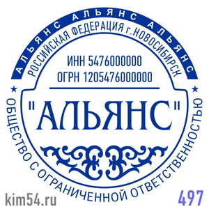 Заказать печать юридического лица № 497. Печать с узором. Срок изготовления печати от 2-х до 4-х часов. Срочное изготовление печати за 15 минут, если требуется укажите в заказе. Сообщите нам, если необходимо согласование макета печати. Цена указана за ...