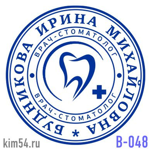 Заказать печать стоматолога В-48. Срочное изготовление печати врача 15 минут. Стандартный срок изготовления печати врача - 2 часа. Печать врача изготавливается диаметром - 25-30 мм. Оптимальный размер врачебной печати составляет 29 мм. Возможно изготов...