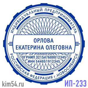 Заказать печать ИП-233. Срочное изготовление печати - 15 минут. Обычный срок изготовления - 2 часа. Диаметр печати - 38 мм. В печати ИП обязательно указывается ФИО предпринимателя. ИНН, ОГРНИП указывается по желанию. На основе шаблона печати предприним...